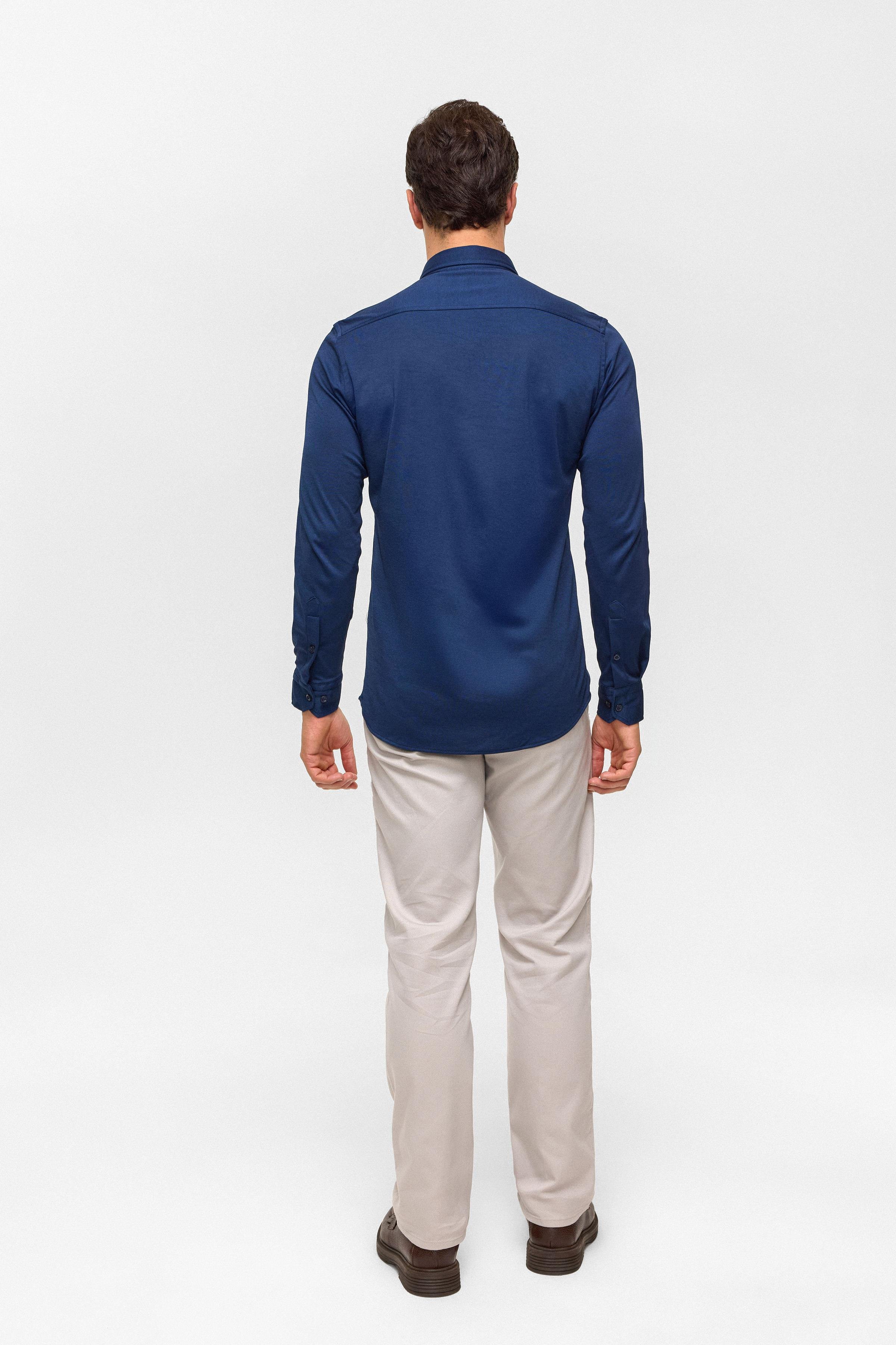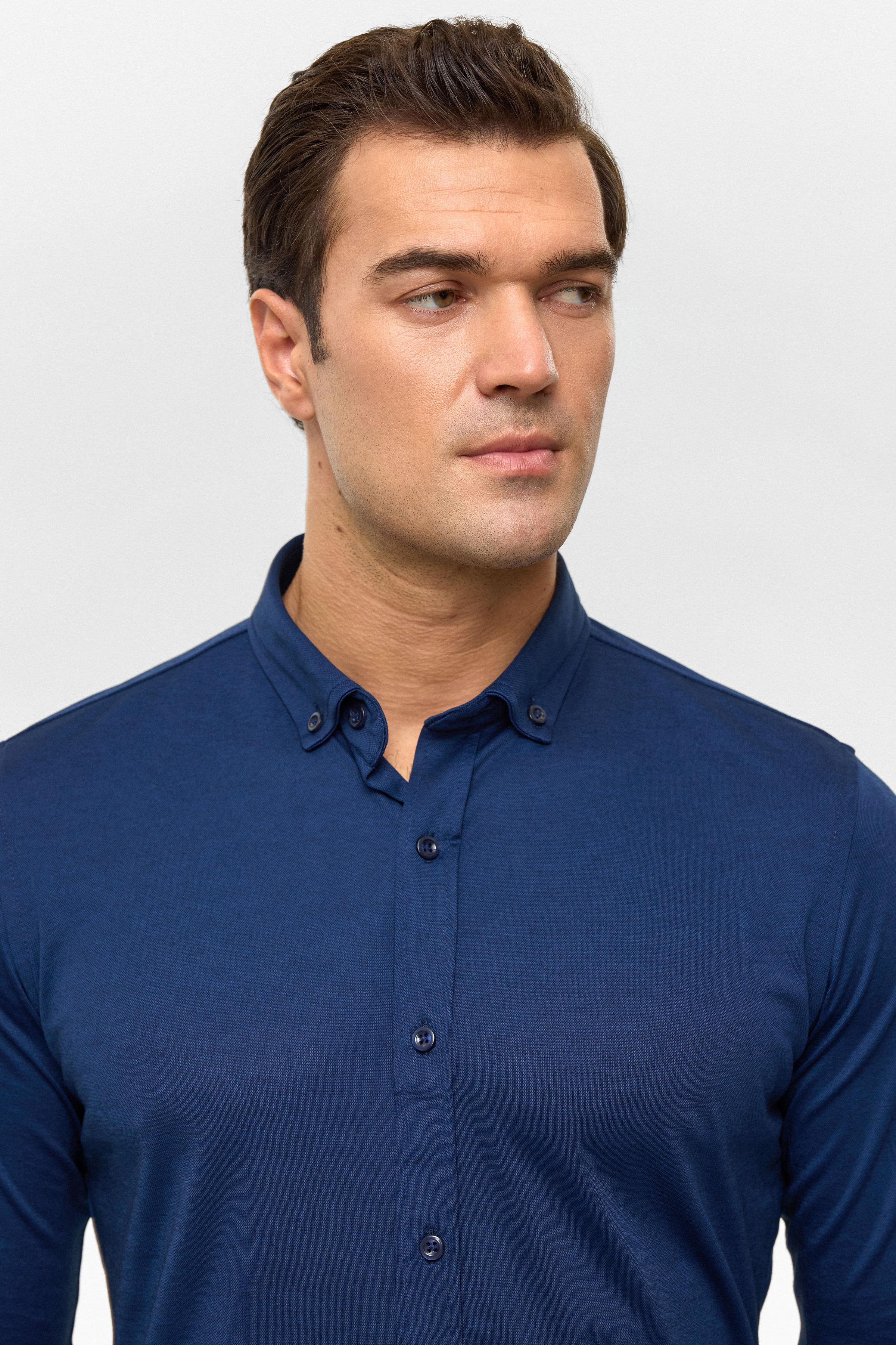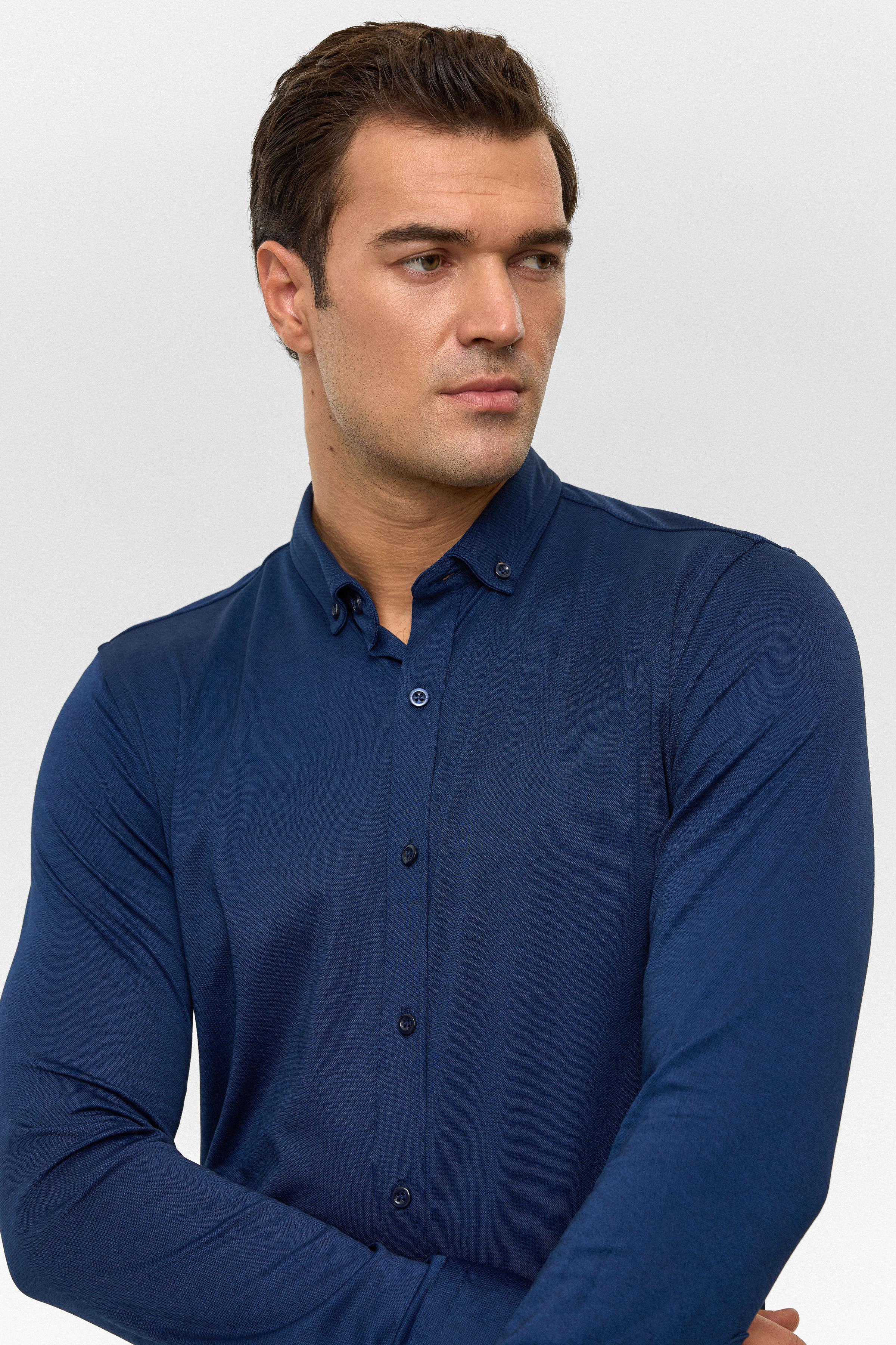 Lacivert Lacivert Slim Armürlü Düğmeli Yaka Gömlek