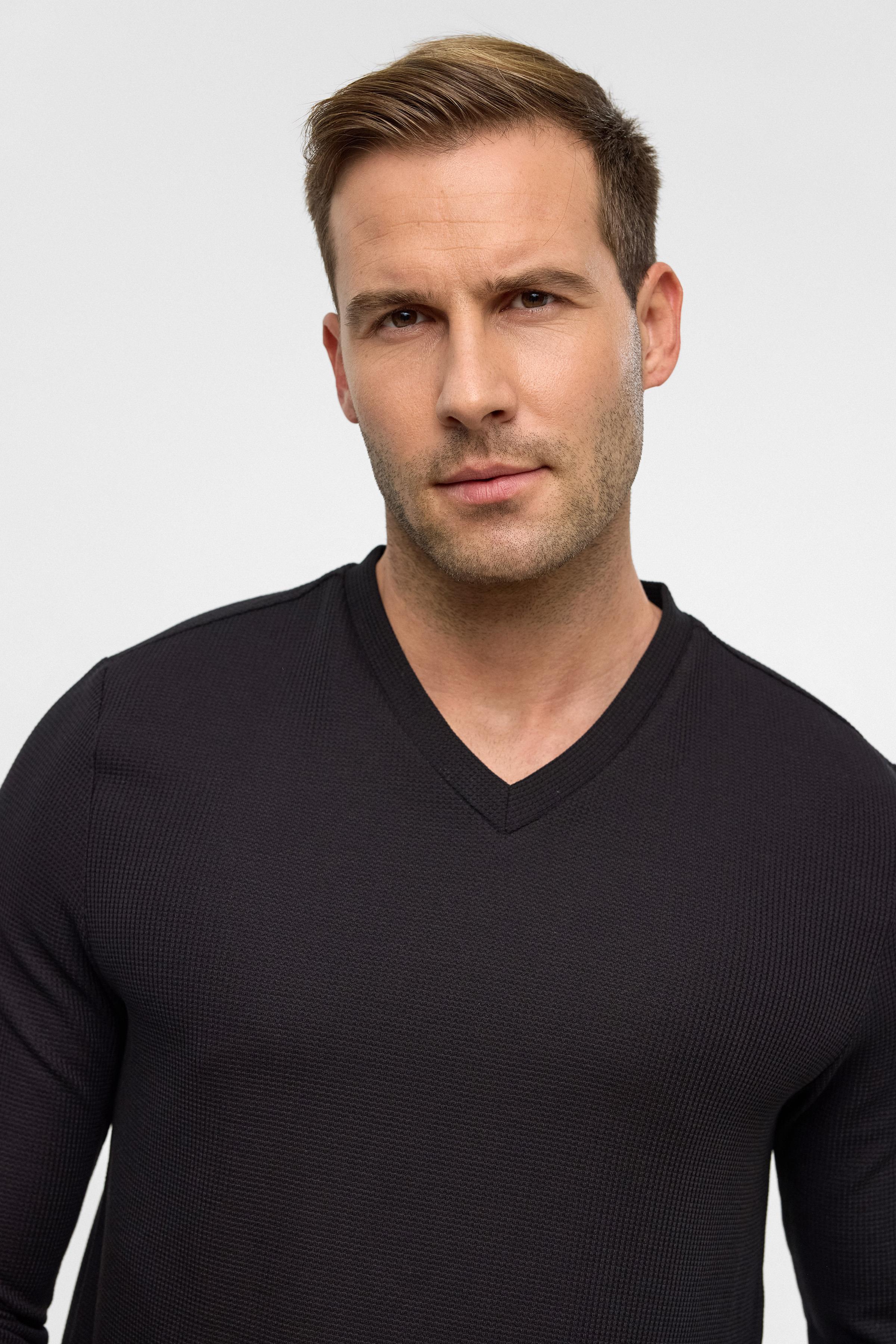 Siyah Siyah Regular Armürlü V Yaka Triko